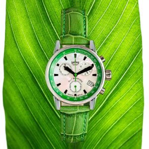 BEI-7652_Elly Beinhorn weisses Perlmutt grüner Ring frontal auf Blatt